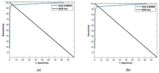 The visual results for the retinal pigment segmentation by RPS-Net are shown in Figure 5, which follows the standard of FP (indicated in green), FN (indicated in red), and TP (indicated in blue). Figure 6a,b represents the ROC curve for the proposed method based on G1 and G2 of Table 5 and Table 6, respectively. They represent the relation between sensitivity and 1-Specificity. Therefore, the black straight line is the equal error rate (EER) line, and the intersection position of the EER line to the ROC curve represents that where sensitivity is equal to specificity. In Table 5 and Table 6, we compared the accuracies by our method with those by previous methods based on their reported accuracies because we followed the same experimental protocol with the same dataset and their algorithms are not open. Therefore, we cannot draw the ROC curves of the previous methods, and include only the curves of our method. The ROC curves by the proposed RPS-Net represents the area under curve (AUC) of 0.80947 and 0.80485 for G1 and G2, respectively.