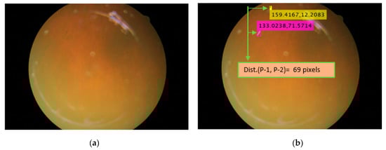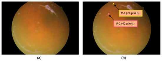 The location of the retinal pigment is an important constraint for considering the progression and migration of spots [,]. In the retinal image, the X-Y location coordinates of the PS can be found for analysis of RP. For example, the X-Y coordinates of the pigments shown in yellow and pink are X = 159.4167 and Y = 12.2083 and X = 33.0238 and Y = 71.5714, respectively. The distance between the pigments observed between different visits of the patient can be another piece of information that can be useful for migration analysis of the PS. As shown in Figure 8a,b, the distance between the two spots can be found, which is approximately 69 pixels for this specific example.