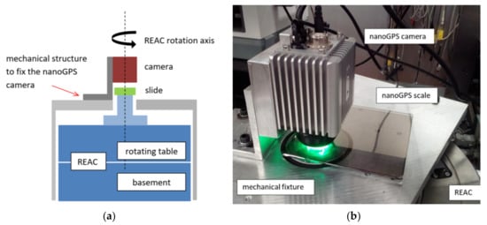 The scheme and picture of the experiment setup for the comparison between nanoGPS OxyO® encoder and REAC are shown in Figure 2. The nanoGPS scale was glued on a mechanical part, in turn fixed to the REAC rotating table, and centered on its rotation axis. The nanoGPS camera was mounted vertically on an L-shaped structure fixed to the reference frame and aimed at the scale. The mounting had some degrees of freedom to allow for the alignment of the camera along the REAC rotation axis. The vertical distance between camera and scale was not a critical issue, since the nanoGPS was equipped with a liquid lens that could adjust the focus of the camera in a range of some millimeters. When the REAC table rotated on an angle αREAC, the camera observed the scale rotated by the same angle, and the nanoGPS system measured angle αOxyO. Therefore, the comparison between the two instruments simply consisted of the comparison between the two measured angular values, αOxyO and αREAC.