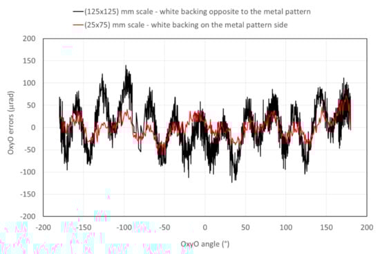In order to evaluate nanoGPS accuracy, the REAC table was rotated in steps of 5 mrad up to 2π (hence, 1296 points per revolution). Due to the footprint of the 125 × 125 mm scale, it was not possible to explore the entire 2π angle in a unique position of the scale. Hence, four different measurements at the four vertices of the scale were performed, each time exploring an angular interval of about 2π/3. Afterwards, measurements were rearranged and stitched up as a function of the rotation angle. Figure 4 shows differences between angular values measured by the OxyO® system, with the two different scales and the angles measured by REAC plotted against the rotation angle. The black line represents the errors of the OxyO® system obtained with the 125 × 125 mm scale, with white backing on the side opposite to the metal patterns. Errors were encompassed within ±145 µrad, but nonlinearity with a period of about 30° is clearly visible.
