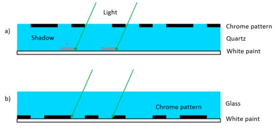 Vertical section sketch of two scales: (a) scale made out of quartz with white backing on the side opposite to the metal patterns, and (b) scale made out of float glass, with white backing on the side with the metal patterns.