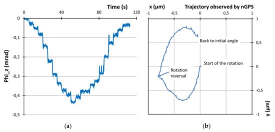 As a simple illustration, we investigated the properties of a rotation bearing with nanoGPS. We placed a 5 × 5 mm2 nanoGPS scale on a rotary bearing (fluid bearing taken from a hard-disk drive). We slightly rotated the bearing by pushing a lever connected to the bearing by using a step actuator. Then, we rotated the bearing back toward its initial position. The nanoGPS records are presented in Figure 6. Figure 6a shows that the rotation proceeded through rather irregular steps, up to an angle of 420 µrad, and that it returned to its original orientation within 25 µrad. However, Figure 6b shows that the movement of the rotation bearing was not pure rotation, as the movement of the scale in x, y was not a small circular arc (as would be anticipated in the case of pure rotation), but 2D displacement by more than half a micron with significant hysteresis. This showed that the bearing had travel that could not be approximated as pure rotation; in that case, micrometric accuracy of the positioning system is required. This can be determined in a very simple way with a nanoGPS encoder, while it would probably be much more difficult to implement laser interferometry, which is a well-established technique to measure small displacements, as it requires excellent laser alignment that may not be easy to implement on a rotating system.