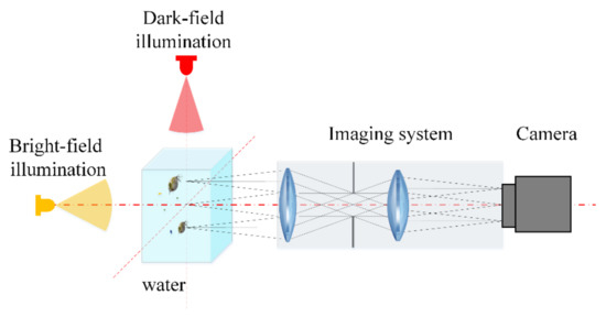 Underwater imaging systems with bright-field or dark-field illumination have been used to observe zooplankton in situ, as shown in Figure 1. Bright-field illumination can illuminate the entire sample so that the specimen appears as a dark image against a brightly lit background [20]. However, due to the light scattering caused by the huge number of particles in seawater, the images acquired by a bright-field imaging system usually contain noise, which severely degrades the image quality. It is difficult to separate the partly transparent zooplankton from the background image. Dark-field illumination is a technique employed in optical microscopy that eliminates scattered light from sample images. As a result, only the sample itself is illuminated, while the background remains dark [21]. Therefore, dark-field microscopic imaging was adopted to capture zooplankton images in water. The light sources illuminated the target area from both sides of the optical axis of the imaging system. The digital camera and lens were positioned in front of the target area, while the direction of illumination light was perpendicular to the optical axis. Therefore, illumination light paths and imaging light paths were separated to depress backscattering light delivered to the imaging sensor of the camera. Since the incident light could not directly enter the image optical path, only the scattering beam from the plankton body could be received by the imaging sensor. Consequently, high-contrast and high-definition images of zooplankton could be obtained with a dark background. All objects in the target area were clearly recorded by the camera. Each capture was assumed to examine a water sample equal to the volume of the imaging area. The volume of the target area was determined by the field of view and depth of field of the optical lens.