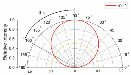 where I0 represents the luminous intensity of the center light-emitting angle, θ is the view angle of the LED, and m is the parameter indicating the luminous intensity spatial distribution. For example, m equals 1 for an ideal Lambertian emitter. The relationship between the emission angles and axial light intensity distribution for the ideal Lambertian emitter is shown in Figure 3. The parameter m is calculated using the half width viewing angle θ1/2, which is the viewing angle at which the radiant intensity is half of the value in the normal direction [26], which is given by: