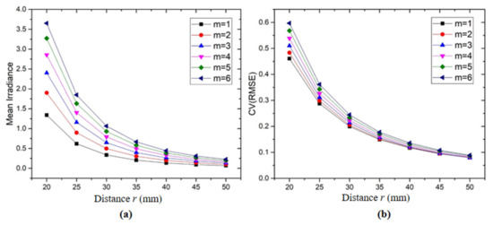 (a) The mean irradiance as a function of the distance r from a light-emitting diode (LED) lamp to the optical axis at different values of m; (b) the uniformity (CV(RMSE)) of the illumination surface as a function of the distance r from an LED lamp to the optical axis at different values of m.