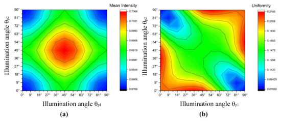 Figure 6 shows the mean intensity and uniformity of illumination produced by two pairs of LEDs at different illumination angles. The smallest irradiance was obtained when the pairs of LED arrays were in horizontal or vertical positions. While the two pairs of LED arrays were located at ±45° angles, the largest irradiance value was observed. The ratio of the maximal and minimal mean irradiance in the imaging plane was 1.04.