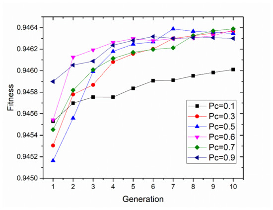A new generation of child systems is produced from the genetic material of the parent generation. The roulette wheel selection, as a genetic operator, is used for selecting potentially useful solutions for recombination. The mutation operator that was used was the common bit-flipping of each gene of the chromosomes with a specific probability, known as the probability of mutation Pm, which was also a parameter of exploration. The probability of mutation was set as 0.1. Crossover was performed between couples of the individual parents. A series of experiments were carried out to determine an optimal value range of probability. The crossover’s probability Pc was set in the range from 0.1 to 0.9, and the finishing criterion was set to reach 10 generations. The fitness results and generation values can be observed in Figure 8. The experiment using a 0.6 crossover probability shows a quicker optimal solution for the problem.