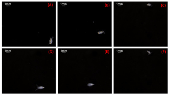 Images of zooplankton captured by the imaging system in the water (A–F).