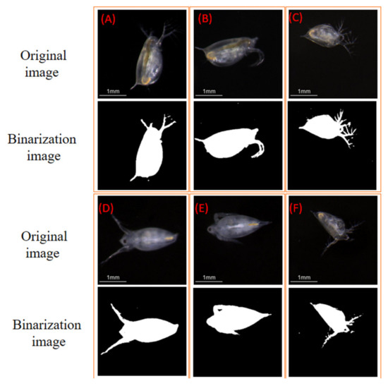 The original images and binarized images of zooplankton in the ROIs (A–F).