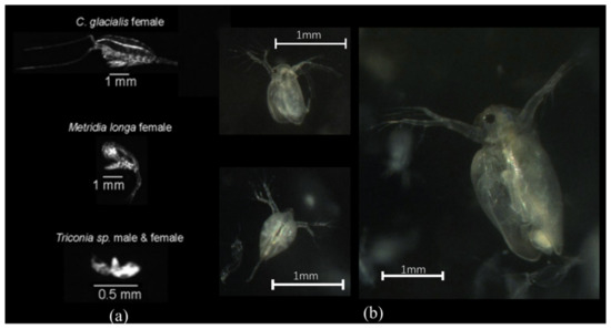 Furthermore, the proposed underwater imaging system was compared with the LOKI system. Figure 14 presents images of biological objects captured by LOKI and the proposed system. The LOKI system has a large field of view and could capture the large size of objects. However, color information was lost in the LOKI system. Additionally, small-sized objects could not be accurately recorded, especially when the object was <1 mm (Figure 14a). Our proposed system could capture very detailed body parts (e.g., antennae) in colored images. For the semi-transparent Daphnia, the organs in the body were able to be clearly presented (Figure 14b). In this work, the tests were carried out in simulated conditions in the laboratory which has few noises comparing with in situ observation, such as the results from LOKI system [11]. In the further, our developed imaging system will be deployed in coastal area.