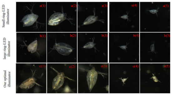 In order to evaluate the effect of the optimal illumination on the imaging performance, we considered both common illumination cases—a small ring-LED illuminator (the model code: JS-RL-100-00-W, YUAND Tech, Shenzhen, China) and a large ring-LED illuminator (the model code: JX-RX-120-00-W, YUAND Tech, Shenzhen, Country)—in our designed light source system. The small ring-LED illuminator consists of 49 LED lamps, with an outer and inner diameter of 100 and 70 mm, respectively. The large ring-LED illuminator consists of 63 LED lamps, with an outer and inner diameter of 120 and 90 mm, respectively. The imaging system was placed in a fixed position near the center lighting position. The zooplankton sample was living Daphnia. Images were collected under three different lighting conditions. We selected five groups of pictures with a similar growth status and swimming posture from the three imaging data sets. The montage in Figure 15 clearly illustrates the various illumination modalities and the corresponding images generated by the imaging system.