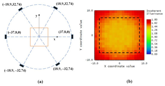 In addition, a comparison test on optimized lighting configuration and equally placed lighting configuration was conducted. The six LEDs in the equal lighting configuration were equally spaced apart in a circle arrangement. The radius was the same with the optimized configuration (i.e., 37.8 mm). The geometric arrangement of the equally placed LED array and its irradiance map are presented in Figure 16. The dashed rectangle represents the field of view of the camera in the Figure 16b. As can be seen from the irradiance map, the illumination uniformity is low in the four corners and border area in the target plane. By analyzing the illuminance distribution pattern of our proposed configuration (Figure 9b) and the equally spaced configuration (Figure 16b), the optimized lighting configuration shows better uniformity than the equally spaced one.