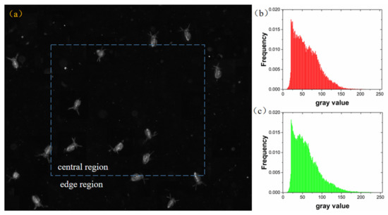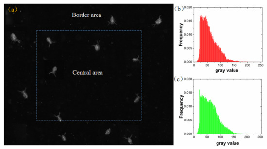 Accordingly, Daphnia images captured by our optimized configuration was analyzed in the same manner (Figure 18). The average normalized histogram of Daphnia images in central and border area are presented in Figure 18b,c. The image in central area and border area presented similar pattern in histogram. The experiments showed that the mean gray values of the Daphnia images in the central and border area was 61.7 and 61.9, respectively. Therefore, the gray value distribution shows that the illumination difference between central and border area was relatively small under the optimized illumination condition. The imaging brightness of the organism is close to the same level at different positions in the camera’s field of view, which can provide more accurate images for further analysis.
