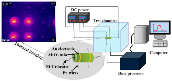 The obtained samples were mixed with a small amount of binder (Ethyl cellulose: Terpineol = 1:9) and ground together in an agate mortar to form a paste. Then it was uniformly coated onto the surfaces of Al2O3 ceramic tube with a pair of Au electrodes and four Pt wires. After dried in air, a calcinations step at 400 °C for 2 h was performed to completely remove the organic binder and make the material stick tightly on a ceramic tube. A Ni–Cr resistor was inserted into the ceramic tube for controlling the working temperature by adjusting the voltage. The ceramic tube was welded on a special pedestal with six poles to measure the sensing performance [53]. Before testing, the sensor was aged for 24 h on the aging table (TS-64B) to stabilize the resistance. The sensor was installed into a test chamber. Ambient humidity and temperature were maintained at 40% and 30 °C during the test, respectively. Schematic illustration of the experimental platform and a thermal image of the heated ceramic tube are shown in Figure 1. The sensor response was defined as S = Rair/Rgas, where Rair and Rgas are the sensor resistances measured in air and in analyte gas atmosphere, respectively [54].