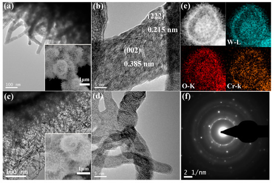 (a) TEM (b) high-resolution transmission electron microscopy (HR-TEM) images of WCr-0mg; (c) TEM (d) HRTEM images of WCr-100mg; (The inset images of a and c are the SEM images of WCr-0mg and WCr-100mg, respectively.) (e) Elemental mapping for W, O, and Cr elements in WCr-100mg; (f) selected area electron diffraction (SAED) pattern of WCr-100mg.