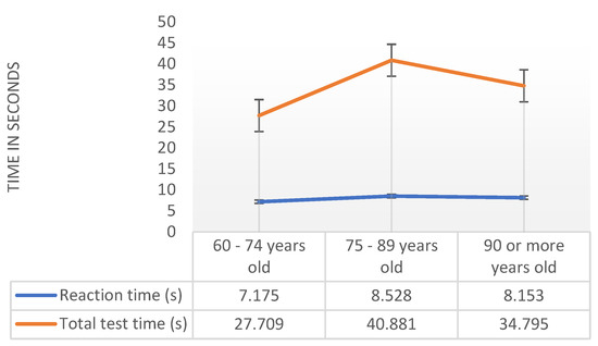 After checking the requirements, we used the ANOVA test. We found out that there is no statistically significant difference (alpha = 0.05) between the three age groups for all variables/measurements of interest. Figure 1 shows the mean values for the different age ranges for the reaction time and total test time variables obtained with the pressure sensor. Thus, the results of the F-test, through the respective limited probability associated with the test statistic allowed us to conclude that the average values between the three age groups are statistically equal for the analysis for the magnetometer sensor, such as Pr (F > F-test) = 0.231 > 0.05 for the total test time variable, and Pr (F > F-test) = 0.815 > 0.05 for the reaction time variable. Therefore, we accept the null hypothesis that the averages are statistically equal. Although the averages are statistically equal, it is interesting to note that both for the reaction time and for the total variable test time, it is the younger individuals who have shorter times, as expected. However, the group of individuals in this age group is only five people, and the group of older individuals is only eight people. For statistically more relevant results, the population needs to be increased in future experiments.