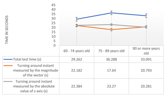 Then, in Figure 2, we can observe the mean values for the different age range for total test time, turning around instant measured by the magnitude of the vector, and turning around moment measured by the absolute value of z-axis variables obtained with the magnetometer sensor.