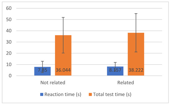 In Figure 3, we can observe the mean and the standard deviation values for reaction time and total test time measured by the pressure sensor by groups of diseases related to mobility and not directly related to movement. Through using the Student’s t-test to compare two groups of independent samples, it was possible to assess whether there are statistical differences in the level of measurements made between individuals with diseases related to mobility and not associated with movement.