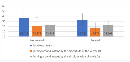 In Figure 4, it is possible to observe the mean values for the total test time (s), turning around instant by the magnitude of the vector (s) and turning around instant by the absolute value of the z-axis (s) by magnetometer sensor by diseases related or not related to mobility.