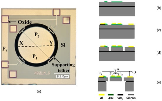 Figure 1a shows the optical micrograph of the adopted MEMS resonator seen from the top. The MEMS resonator is an AlN TPoS disk with a radius of 400 µm, fabricated using the PiezoMUMPs (Piezo Multi-User MEMS Processes) foundry process offered by MEMSCAP [24]. The process begins with a silicon-on-insulator (SOI) wafer and a silicon device layer (Si) that is 10-µm thick. The device layer is a surface-doped n-type layer in order to create an ohmic layer in a subsequent metallization stage to define the contact pads and electrodes. A 200-nm-thick thermal oxide is grown and patterned by reactive ion etching as an insulation layer on the silicon device layer, as depicted in Figure 1b. This is then followed by deposition of AlN as the piezoelectric material by reactive sputtering with a thickness of 500 nm. The AlN layer is patterned by wet etching. The use of AlN has the advantage of having the potential for chip level integration and CMOS compatibility compared to other piezoelectric materials like PZT and ZnO. The 10-µm-thick silicon layer increases energy storage to the resonator compared to a structure that is comprised of only AlN, which generally yields higher quality factors. Next, a metal stack of 20-nm-thick Cr and 1-µm-thick Al is patterned and deposited by a lift-off process to define the contact pads and top electrodes of the resonator, as shown in Figure 1c. Next, the silicon device layer is lithographically patterned and etched by deep reactive ion etching (DRIE) to define the features of the resonator as depicted in Figure 1d. This includes the T-shape tethers on 4 sides of the disk resonator for supporting the structures, as indicated in Figure 1a. The resonator has to be supported from the sides in this case as it is not possible to clamp the structure from the center due to the release method. To release the structure from the substrate, the top side of the wafer is covered with a protective polymer coat first. The back of the SOI wafer is lithographically patterned to define the opening of a cavity, through which the handling layer of the wafer is trench etched by DRIE followed by wet oxide removal of the buried oxide layer. The front side protective coat is then removed to release the device, as shown in Figure 1e, followed by dicing. In this case, the back cavity is circular, which can be viewed in Figure 1a as the dark ring around the TPoS disk. The two Al top electrodes P1 and P2, and the bottom ground electrode PS allow the operation of the device as either a two-port resonator or, by shorting P1 and P2, as a one-port resonator between the connections A and B, as shown in Figure 1e. By relating the top view of the device in Figure 1a, with a side view schematic in Figure 1e, it can be seen that the contact pads of P1 and P2 are isolated from the silicon device layer by 200-nm thermal oxide, while the wide frame tracks around the resonator contact the silicon device layer as grounding pads (PS).
