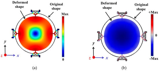 The considered device, with the configuration of the electrodes shown in Figure 1b, vibrates in the so-called radial contour mode. The device was investigated by finite element (FE) analysis simulations using COMSOL Multiphysics. An eigenfrequency analysis to compute the mode shape (eigenfunction) and corresponding modal frequency (eigenfrequency) was performed first. Figure 2a shows the total displacement profile of the fundamental radial contour mode, which can be described by the disk contracted and expanding radially with a nodal point at the center. Figure 2b shows the corresponding distribution of the sum of lateral strains, where the maximum strain is concentrated at the center of the disk for the radial contour mode. The resonant frequency scales inversely with the diameter or radius of the disk. The elasticity properties and density of the structure, which determine the resonant frequency, are dominated by the silicon device layer, which is much thicker than the other constituent layers. In the FE model, to compute the resonant frequency, the elastic matrix of single-crystal silicon for the (100) plane, based on the material properties reported in reference [25], has been adopted instead of assuming isotropic elasticity. In the case of the device presented in this paper, which has a disk radius of 400 µm, the resonant frequency of the radial contour mode obtained by FE is 6.32 MHz.