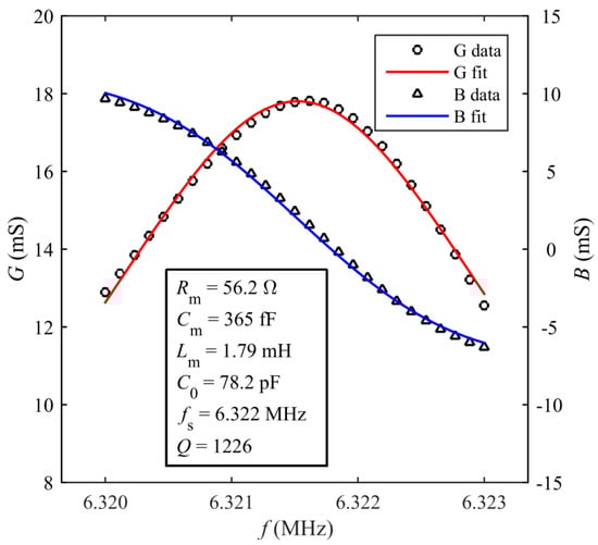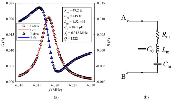 where f is the frequency in hertz. From the fitting, the values of the parameters of the equivalent BVD circuit have been estimated. The resulting fitted curves and the estimated parameters are shown in Figure 3a. From these values, the resonant frequency and the quality factor of the resonator can be calculated as Equations (3) and (4):