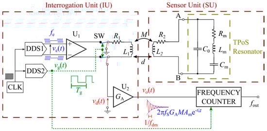 Figure 4 shows the block diagram of the developed contactless interrogation system, which is composed of an interrogation unit (IU) and a sensor unit (SU). The IU is in turn composed of two programmable direct digital synthesizers (DDSs) named DDS1 and DDS2, fed by the common clock CLK, which generate the relevant signals for system operation. DDS1 generates the sinusoidal waveform ve(t) at frequency fe, gated by the square waveform vg(t), with period Tg = Te + Td generated by DDS2. During the time interval Te, the interrogation system is in the excitation phase. Consequently, the switch SW is closed and the fully differential amplifier U1 drives the readout coil, modeled by the inductance L1 and series resistance R1. During the time interval Td, the interrogation system is in the detection phase. The switch SW is open and the readout signal vd(t) across the readout coil is sensed by the high-impedance amplifier U2 and amplified with gain GA = 8. The output voltage vo(t) is fed to a frequency counter to obtain the readout frequency fout.
