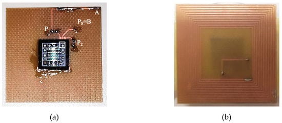 Figure 6 shows the fabricated SU. A planar spiral coil has been milled from a copper-clad flame-retardant (FR4) substrate with dimensions of 35 mm × 35 mm. The coil has been electrically characterized at fS, where it has an equivalent resistance R2 = 7.23 Ω and inductance L2 = 8.19 µH. The silicon chip with the TPoS resonator has been glued at the center of the spiral coil and bonded through gold wires to the connection pads.