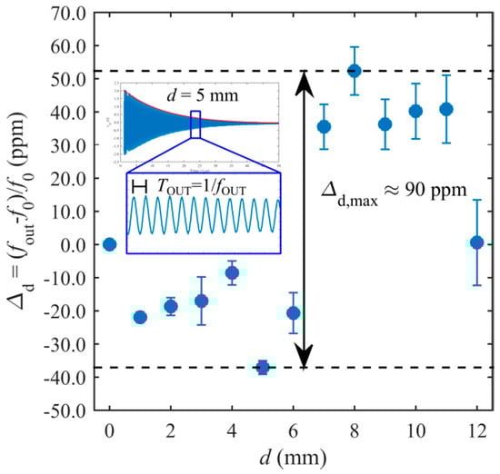 For each value of d, ten repeated measurements have been acquired and the corresponding standard deviation σ(d) was calculated. The error bars in Figure 7 represent the relative standard deviation, i.e., σ(d)/fout. As it can be observed, in the explored range of distances, the maximum variation of Δd is about Δd,max = 90 ppm, validating the theoretical predictions of the model in Section 2, according to which fout does not depend on M, and hence, on d. The residual difference between f0 and fS can be ascribed to secondary effects not accounted for in the proposed model of the interrogation principle. The inset of Figure 7 shows the typical waveform of vo(t) during the detection phase, corresponding to d = 5 mm. As expected, vo(t) is a damped sinusoid at frequency fout = fdm.