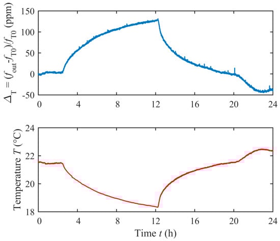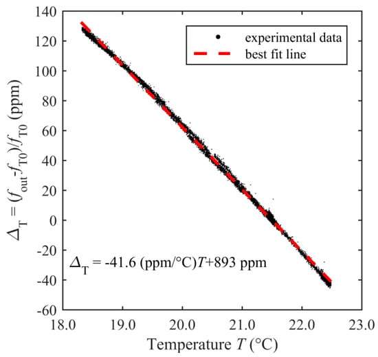 Firstly, the system was tested for temperature sensing, by acquiring fout and the ambient temperature T by means of a Pt1000 sensor close to the resonator. Figure 8 shows ΔT = (fout – fT0)/fT0, i.e., the relative deviation of fout with respect to fT0, where fT0 is fout at t = 0, over a period of 24 h, while the resonator undergoes ambient temperature changes. It can be observed that ΔT follows the temperature T, with an opposite correlation evidenced by Figure 9, which plots ΔT as a function of T, similarly to the results in reference [26]. The best fit line of the experimental data allows estimating, for the considered temperature range, a temperature coefficient of frequency (TCF) of −41.6 ppm/°C.