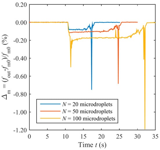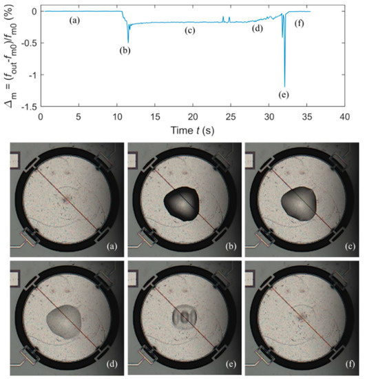 The upper plot of Figure 11 shows the measured values of Δm = (fout – fm0)/fm0 as a function of time for N = 100, i.e., the relative deviation of fout with respect to fm0, where fm0 is fout at t = 0, i.e., with no added microdroplets. It can be seen that the response of the resonator, considering also the transient behavior, has a complex pattern. The analysis of such a pattern requires sophisticated modeling [27] which is not considered in the present work that is dedicated to the validation of the time-gated technique innovatively coupled to TPoS resonators. Hence, in the following, only a qualitative discussion of the observed phenomena will be offered. For this purpose, in Figure 11a–f, pictures are shown, taken in correspondence with selected events along the deposition and evaporation process of the droplets.