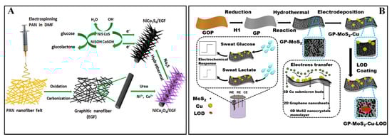 (A) The fabrication processes of porous NiCo2S4 nanowires and their applications in glucose biosensing [34]. Reproduced with permission Copyright 2019, Elsevier B.V. (B) The fabrication of biosensor based on MoS2 nanocrystals for sensing glucose and lactate in sweat [62]. Reproduced with permission Copyright 2017, Elsevier B.V.