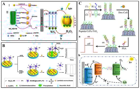 Guo and Liu et al. [50] have fabricated a PEC biosensor for detecting a breast cancer biomarker human epidermal growth factor receptor-2 (HER2) (Figure 2A) using WS2 nanowire on Ti mesh (WS2 NW/TM) as photoactive material. Under visible light excitation, photo energy collected by WS2 NW/TM electrode was higher than that of its bandgap. Accordingly, electron was transferred from valence band (VB) to conduction band (CB), and then CB electron was transferred to the surface of Ti mesh, finally the hole in VB was scavenged by H2O2. Based on the electron transfer process, photocurrent was generated. Moreover, to obtain a dual signal PEC amplification strategy, AuNPs modified with glucose oxidase (GOx) and HER2 specific peptide for signal amplification were utilized. The localized surface plasmon resonance (LSPR) of AuNPs generated a collective oscillation of free electrons when excited by visible light. The free electrons can transfer from Au to the CB of the WS2 NW/TM electrode, which enhanced the photoelectric transfer efficiency and then achieved dual signal amplification. GOx modified in AuNPs catalyzed glucose to produce H2O2, which scavenged the hole in VB of the WS2 NW/TM electrode.