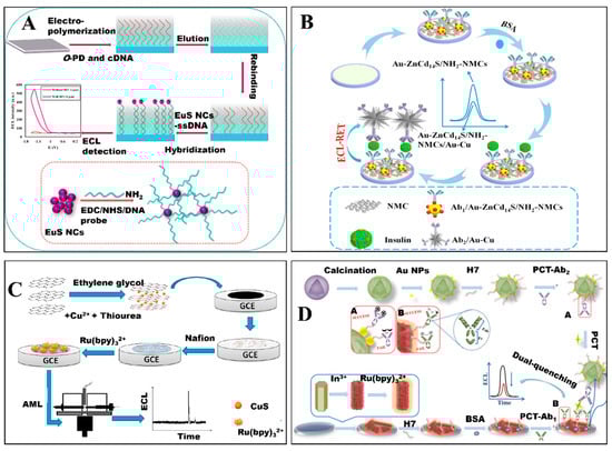 (A) Schematic diagram of the HIV gene biosensor using EuS nanocrystals as luminophore [70]. Reproduced with permission Copyright 2018, Elsevier B.V. (B) The fabrication of insulin biosensor based on Au-ZnCd14S [79]. Reproduced with permission Copyright 2017, Elsevier B.V. (C) Schematic fabrication process of ECL sensor and CE-ECL detection [80]. Reproduced with permission Copyright 2016, Elsevier B.V. (D) The fabrication of immunosensor based on hollow In2S3 nanotubes for procalcitonin detection [52]. Reproduced with permission Copyright 2019, Elsevier B.V.
