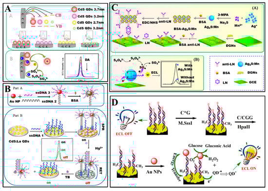 (A) ECL biosensors for dopamine based on CdS QDs [134]. Reproduced with permission Copyright 2016, Elsevier B.V. (B) Fabrication of the ECL-RET aptasensor for thrombin based on CdS: La quantum dots film and AuNPs [135]. Reproduced with permission Copyright 2019, Elsevier B.V. (C) Schematic diagram to show (A) the ECL immunosensor fabrication process and (B) ECL mechanism of Ag2S: Mn QDs [136]. Reproduced with permission Copyright 2017, Elsevier B.V. (D) Schematic illustration of ECL biosensors bade on CdS QDs for detection of the MTase activity [137]. Reproduced with permission Copyright 2016, American Chemical Society.
