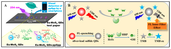 (A) Schematic illustration for ppGpp detection using Eu-MoS2 QDs test paper [142]. Reproduced with permission Copyright 2020, Elsevier B.V. (B) Illustration of H2O2 detection based on NIR-II fluorescence Pb-doped Ag2S quantum dots [69]. Reproduced with permission Copyright 2019, Elsevier B.V.