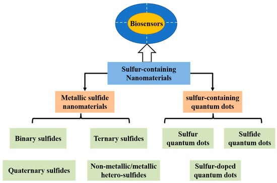 A variety of sulfur-containing nanomaterials have been reported, such as metallic sulfide nanomaterials, sulfur-containing quantum dots, sulfur-containing organosilicon compounds, and lithium sulfide materials [7,8,9,10]. Sulfur-containing nanomaterials (e.g., metallic sulfide nanomaterials and sulfur-containing quantum dots) exhibit excellent properties, such as nanometric scale, water-dispersible, non-toxicity, excellent catalytic activity, conductivity, photoactivity and fascinating optical properties, and they have proven useful in many biomedical applications including imaging and sensing [7,8]. As known, metallic sulfide nanomaterials have been used as photoactive materials which can generate photocurrent excited by light in biosensing systems. Some sulfur-containing quantum dots can stably bind with biomolecules or other nanomaterials due to their functional groups (e.g., amino, carboxyl and sulfhydryl groups) as common reaction sites within biological systems. This allows their versatile roles as functional biomaterials in biosensor, biolabeling, drug delivery and diagnostic imaging technology [7,11,12,13]. Moreover, some sulfur-containing quantum dots (e.g., Ag2S quantum dots), exhibit high absorption in near-infrared (NIR) region, which enables their applications in bioimaging, biolabeling, deep tissue imaging, diagnostics and photodynamic therapy [7]. In this review, we will summarize the most recent advances on the applications of biosensors fabricated based on sulfur-containing nanomaterials and their composites (Scheme 1). Since there are too many sulfur-containing nanomaterials, it is impossible to provide a comprehensive overview of all sulfur-containing nanomaterials in a mini-review. Thus, we aim to provide two categories of sulfur-containing nanomaterials, i.e., metallic sulfide nanomaterials and sulfur-containing quantum dots. Concretely speaking, the metallic sulfide nanomaterials include binary, ternary, quaternary and non-metallic/metallic hetero-sulfides. The sulfur-containing quantum dots consist of sulfur, sulfide and sulfur-doped quantum dots. Firstly, we will briefly introduce various kinds of metallic sulfide nanomaterials or sulfur-containing quantum dots and summarize their synthetic approaches, respectively. Then, we will discuss the possibility as biosensors of the two categories, respectively. We also summarize the applications of biosensors based on metallic sulfide nanomaterials or sulfur-containing quantum dots, respectively. Lastly, the future perspectives and challenges of biosensors based on metallic sulfide nanomaterials or sulfur-containing quantum dots are briefly rendered.