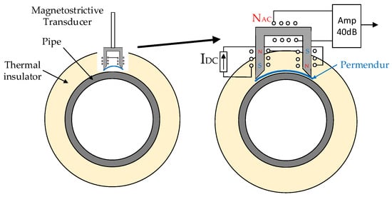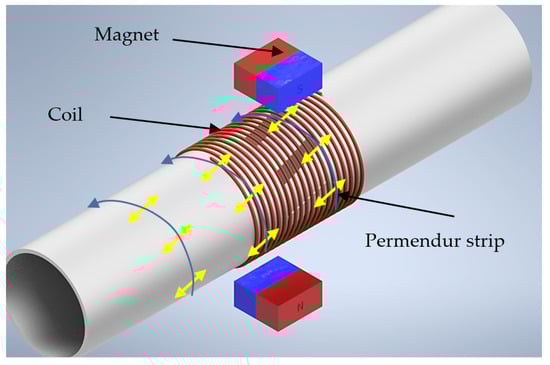 In solar thermal power plants, the pipelines are surrounded by thermal insulation, which makes it difficult to use transducers such as those shown in Figure 1. To solve this problem, a modification of the sensor was proposed [20] that reduced the number of permendur strips used to one.