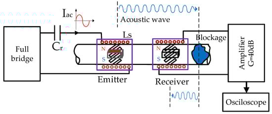 The emitter is activated with a full bridge inverter. This inverter drives a resonant circuit formed by capacitor Cr and the emitter winding inductance [29,30]. As a consequence of the resonance, the shape of the current through the solenoid is quasi-sinusoidal, generating the aforementioned alternating magnetic field with origin of the vibration in the permendur strips. Although the distance to the blockage considered in the tests may seem short, the EMAT technique can also be used for longer pipes, since guided waves have already proven their usefulness in travel spans of several tens of meters [17,18,27].