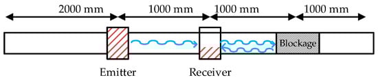 The permendur strips were attached to a 3 mm thick pipe with an inner diameter of Ø37 mm. The distances between the sensors and the blockage in the setup are as represented in Figure 3. The wave must travel 3 m (from the start of the transmission) before it reaches the receiver after bouncing on the blockage. This translates into a delay of ≈950 µs from the instant the emitter is electrically excited (Figure 4).