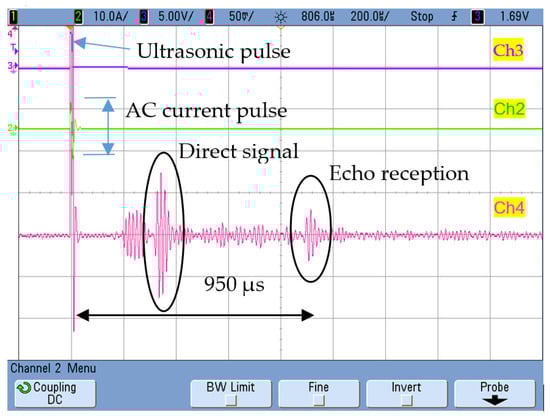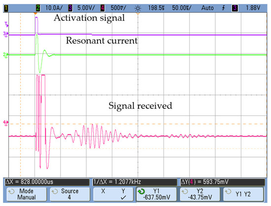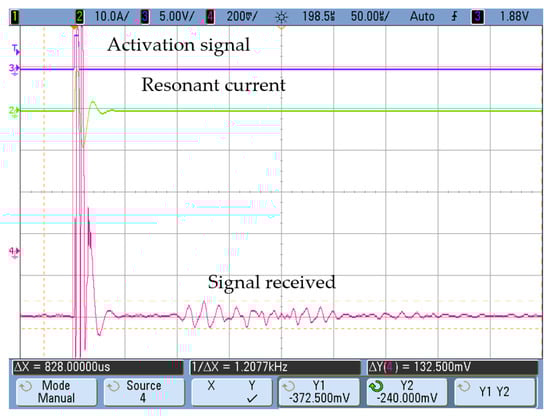 The transmitter activation circuit remained the same as described in Section 2: a full bridge that applied a 5-µs single voltage pulse of maximum 200 V to the transmitter winding (N = 50), giving rise to a resonant current whose amplitude can be controlled with the converter voltage (Figure 9). In this case, the period of the resonant pulse has been reduced to avoid the overlap between the activation and the pulse reception.