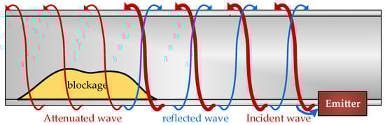 Blockage detection. The torsional wave travels along the pipe until it finds the blockage, which attenuates the propagation and gives rise to a reflected wave.