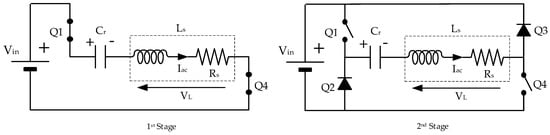 Generating the power pulse in the full bridge inverter is simple. Transistors Q1 and Q4 of one of the diagonals are simultaneously activated during 5 µs to produce the voltage pulse across the resonant stage (Figure 10, 1st Stage). One half-period later, both transistors are switched off and the resonant current flows through the body diodes of transistors Q2 and Q3, thus charging the resonant capacitor, Cr, with a positive voltage (Figure 10, 2nd Stage). This second stage finishes when the resonant current becomes zero and tries to invert its direction. Then, the body diodes of transistors Q1 and Q4 allow the resonant current, Iac, to flow in the opposite direction, thus discharging Cr. This process goes on until both the resonant capacitor and the inductor are completely discharged (Figure 10).