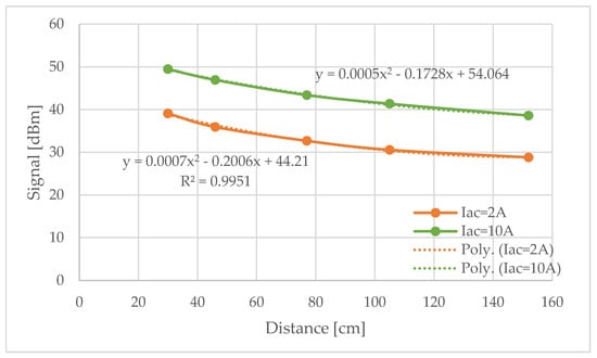 Driven by the above-mentioned converter, the EMAT implemented generates torsional waves. These waves suffer attenuation (A) as they travel along the aluminum pipe with a Ø37 mm inner diameter. Therefore, the amplitude of the signals detected by the receiver decreases with distance (d) to the emitter. Focusing on the maximum voltage received by the sensor, we can represent its value in dBm as a function of distance (Figure 11). Two different values for the excitation current in the transmitter (Iac) were studied. Figure 11 shows the experimental results obtained in both cases. A mathematical expression corresponding to the results obtained can also be obtained. Equation (1) allows us to determine the amplitude of the signal that reaches the receiver as a function of the distance to the emitter for the case Iac = 10 A.