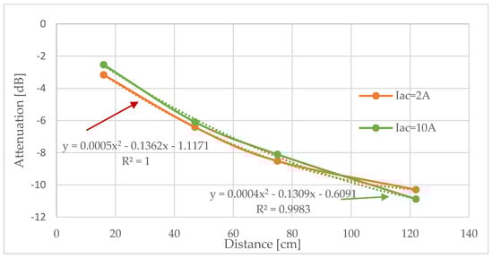 Once the amplitude of the signals received is known (S), the attenuation (A) of the aluminum pipe can be determined in dB. This attenuation was measured at different distances (d) and for different Iac currents. As expected, the attenuation did not depend on the input current, Iac, which defines the input signal (Figure 12).