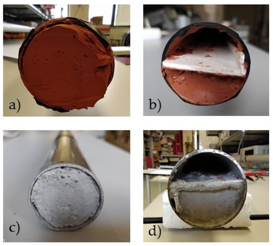 where Vo and Vi represent the signal at the receiver and the signal at the transmitter, respectively. Since the materials deposited on the inner surface of the pipe introduce additional attenuation, an estimation of the blockage nature can be obtained. This assumption was further analyzed by considering four different blockages. Two were made with cement and the other two with silicone. In both cases, a partial blockage and a total one were created (Figure 13).