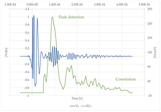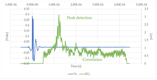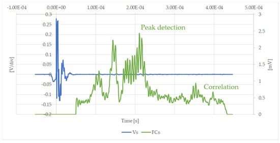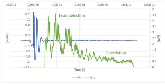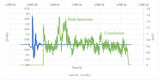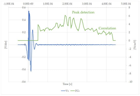 Measured, Vs [V/div], and filtered signal, FCs [Vr/mV], after using the correlation filter in the case of a partial silicone blockage at position A.