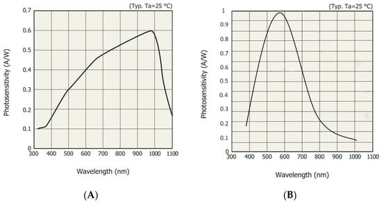 To develop a cost-effective equipment, one of the main points to tackle is the sensor unit. Most commercial equipment are based on CCD (charge-coupled device) sensors [], which can measure multiple wavelengths at the same time. However, their high price and the need for an additional elements to work (mainly an optical element), increase the price of such equipment. For this reason, and pursuing the “minimum viable solution”, i.e., one that makes use of as few elements as possible, we used an individual photodiode as a sensor, which is designed to capture a single beam of light [,] from a wide range of wavelengths. Once the kind of sensor to be used has been chosen, it remained to determine which one to choose, since this type of sensor is marketed with different sensitivities and spectral responses. In order to determine which properties the sensor must have in order to be valid for this type of application, we carried out a comparison between several models. To simplify the explanation, we focused the study on two of them: S1223 [] and OSD15-E [].