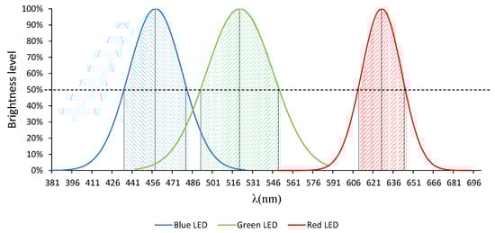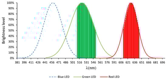 The test carried out concluded that these results were due to the low-quality semiconductor used in most RGB LEDs. An LED emits light as a result of the jump (bandgap) of electrons when they try to pass from one layer (type N) to another where there are holes (type P). The size of this bandgap will determine the type of light emitted by the electrons. A small bandgap will give rise to red light (around 1.91 eV), and a large bandgap to blue light (2.64 eV) [,]. The greater the bandgap, the bluer the light emitted by the diode.