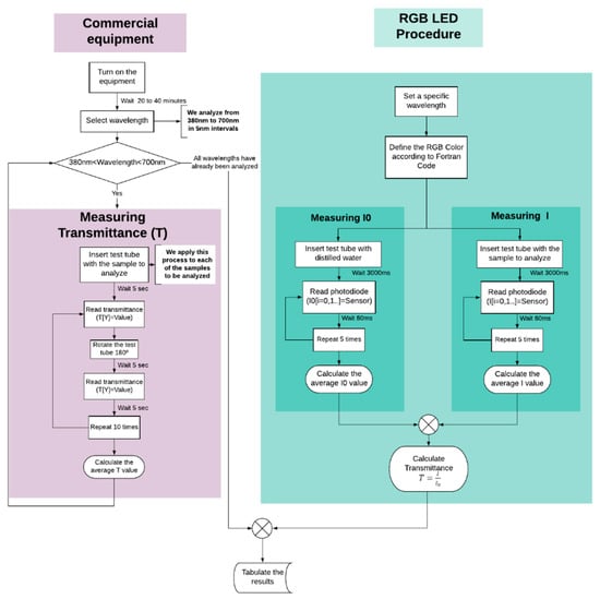 The contributions of this work are as follows: First, we developed a novelty calibration process, in order to measure transmittance values between 510 and 645 nm using a single RGB-LED, without optical devices, and with a high level of accuracy. As indicated in the study [], 18 individual LEDs are needed to be able to analyze water samples between 510 and 645 nm; therefore, a single RGB-LED enables us to significantly reduce the cost of the equipment. Secondly, we provide a simple way to define the red, green, and blue RGB-LED intensity combinations to be used in order to measure the transmittance values that are in agreement with those obtained using the commercial equipment. The novelty lies in using the RGB combination to produce a chemical response in water samples; this can be correlated with that obtained by equipment based on incandescent lamps, where a single wavelength passes through the sample.